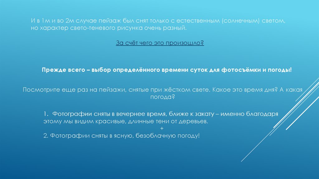 Посмотрите еще раз на пейзажи, снятые при жёстком свете. Какое это время дня? А какая