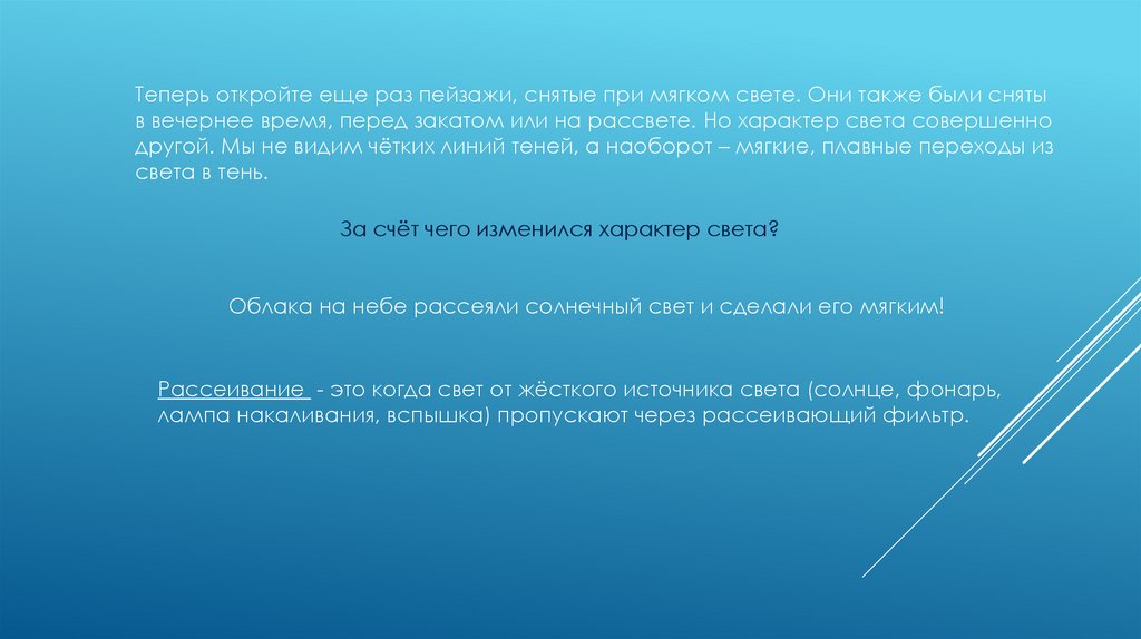 Теперь откройте еще раз пейзажи, снятые при мягком свете. Они также были снятыв вечернее время, перед закатом или на рассвете. Но характер света совершенно