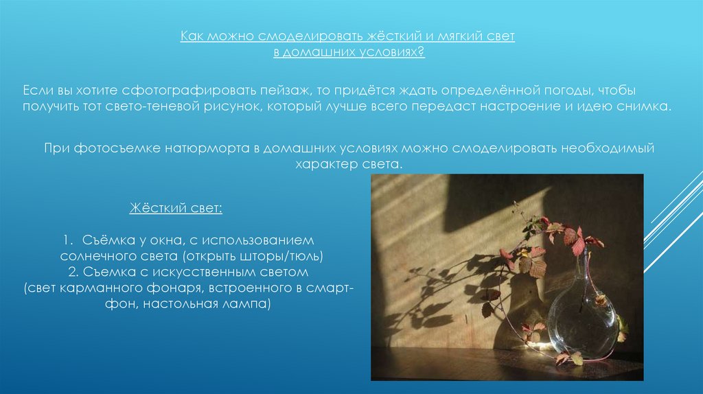 При фотосъемке натюрморта в домашних условиях можно смоделировать необходимый