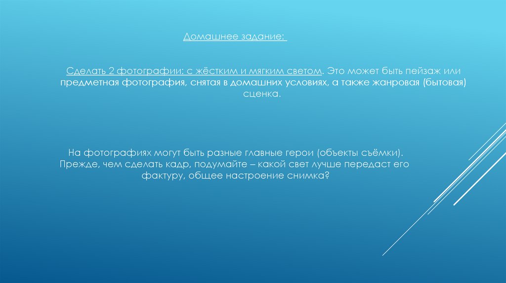 Домашнее задание:Сделать 2 фотографии: с жёстким и мягким светом. Это может быть пейзаж или