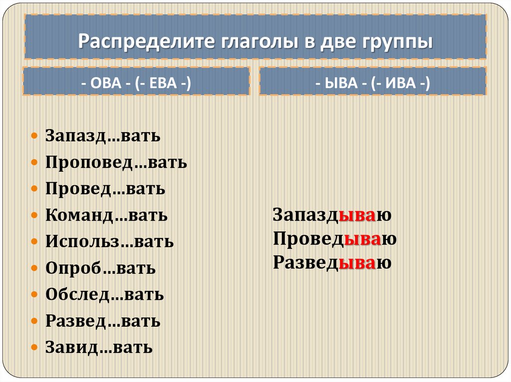 Распределите глаголы в две группы- ОВА - (- ЕВА -)