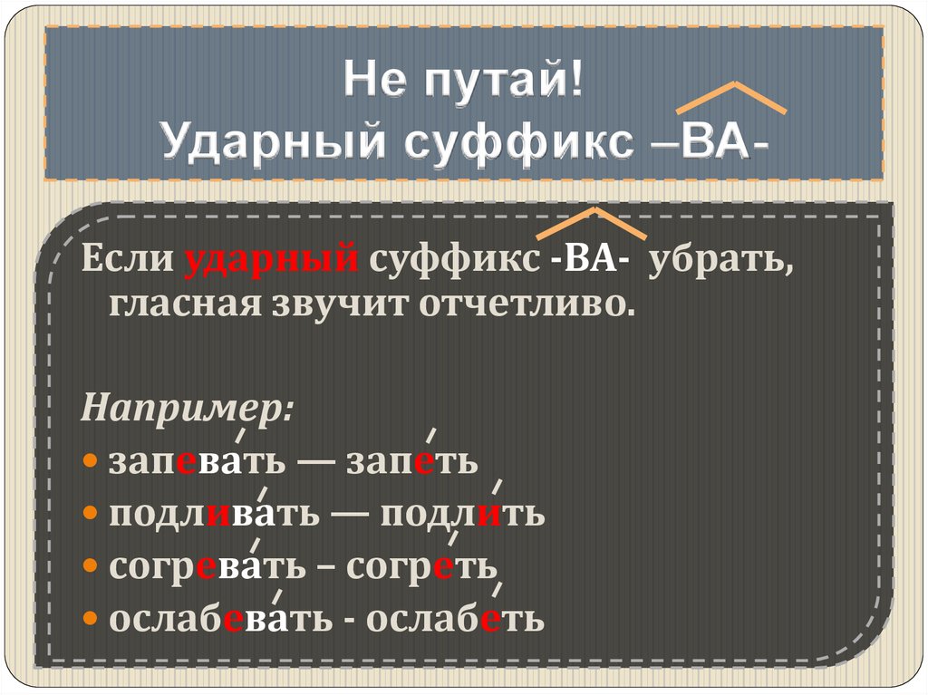 Не путай!Ударный суффикс –ВАЕсли ударный суффикс -ВА- убрать,
