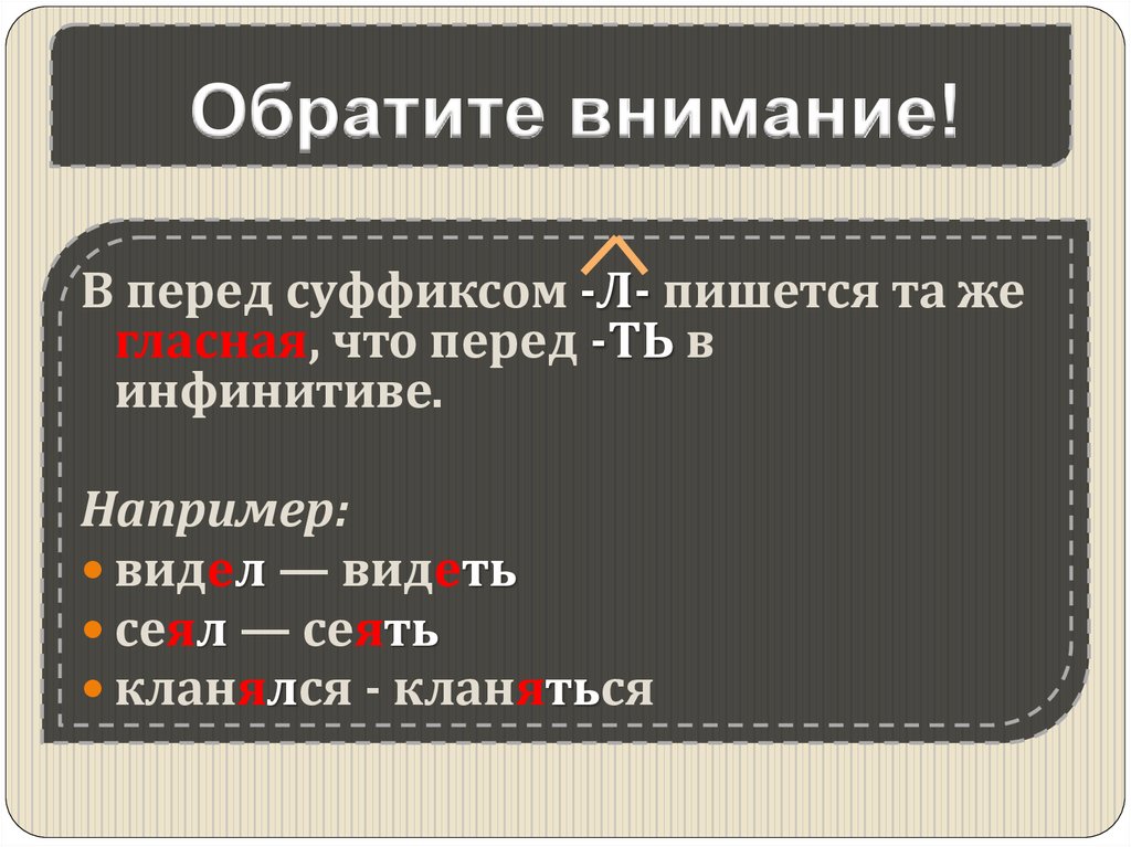 Обратите внимание!В перед суффиксом -Л- пишется та же