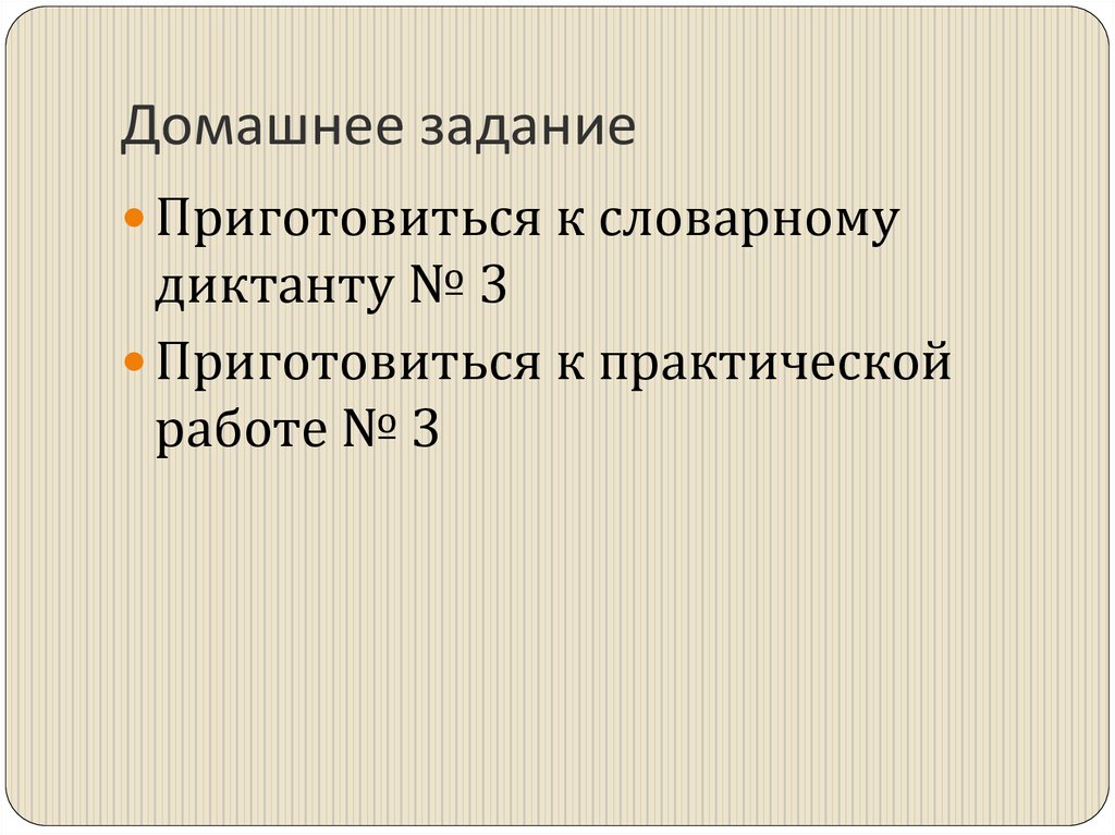 Домашнее заданиеПриготовиться к словарному