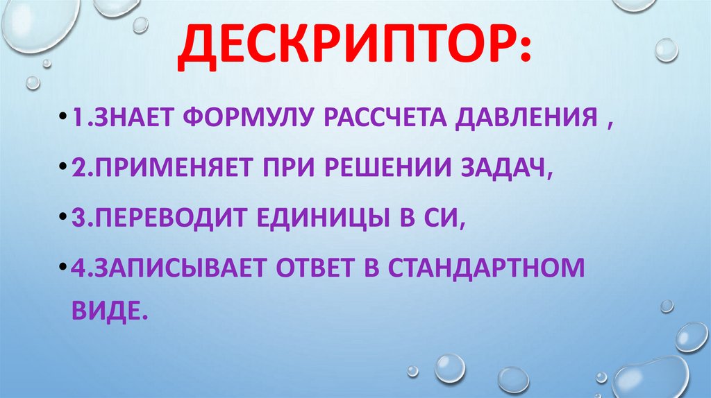 ДЕСКРИПТОР:• 1.ЗНАЕТ ФОРМУЛУ РАССЧЕТА ДАВЛЕНИЯ ,