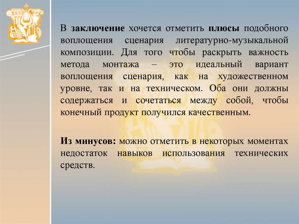 В заключение хочется отметить плюсы подобноговоплощения сценария литературно-музыкальной