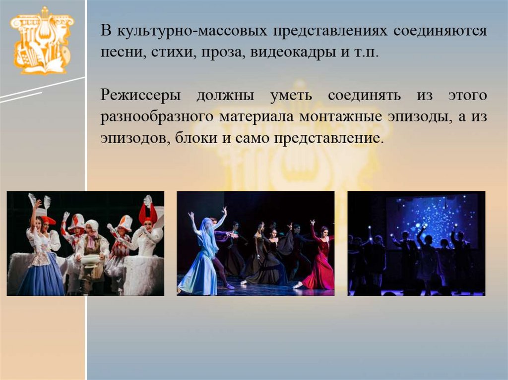 В культурно-массовых представлениях соединяютсяпесни, стихи, проза, видеокадры и т.п.