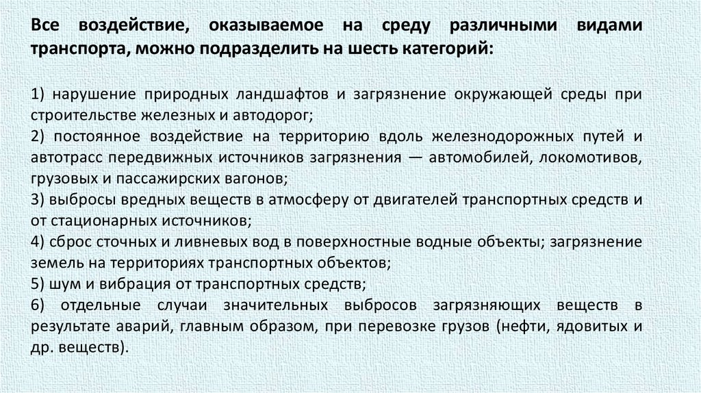 Все воздействие, оказываемое на среду различными видамитранспорта, можно подразделить на шесть категорий: