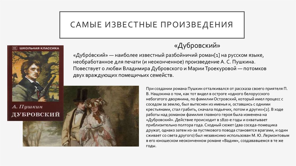 САМЫЕ ИЗВЕСТНЫЕ ПРОИЗВЕДЕНИЯ«Дубровский»