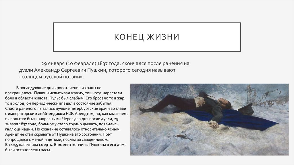 КОНЕЦ ЖИЗНИ29 января (10 февраля) 1837 года, скончался после ранения на