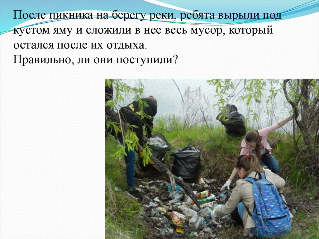 После пикника на берегу реки, ребята вырыли подкустом яму и сложили в нее весь мусор, который