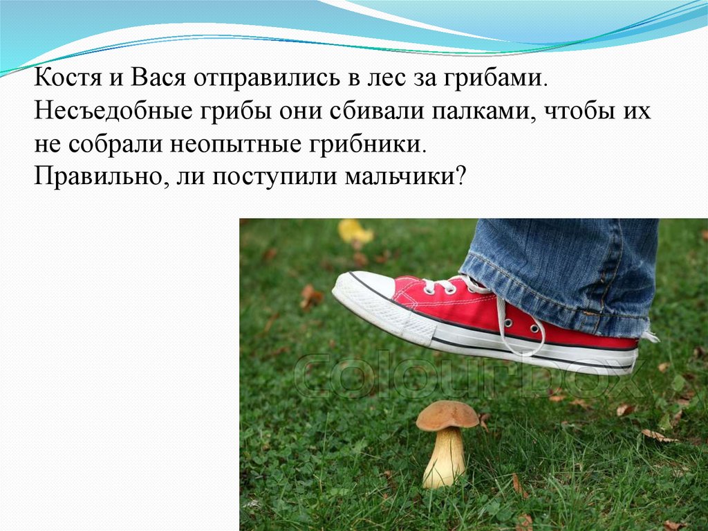 Костя и Вася отправились в лес за грибами.Несъедобные грибы они сбивали палками, чтобы их