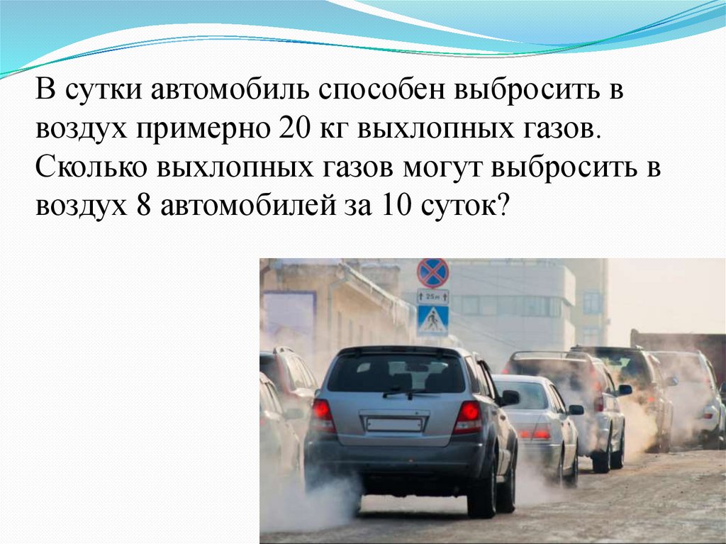 В сутки автомобиль способен выбросить ввоздух примерно 20 кг выхлопных газов.