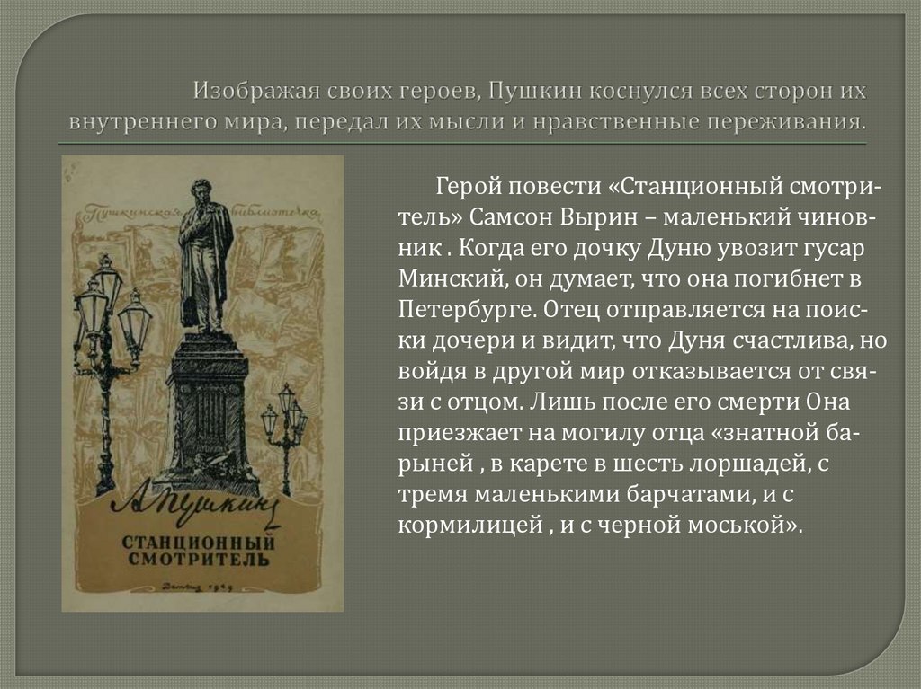 Герой повести «Станционный смотритель» Самсон Вырин – маленький чиновник . Когда его дочку Дуню увозит гусарМинский, он думает, что она погибнет в