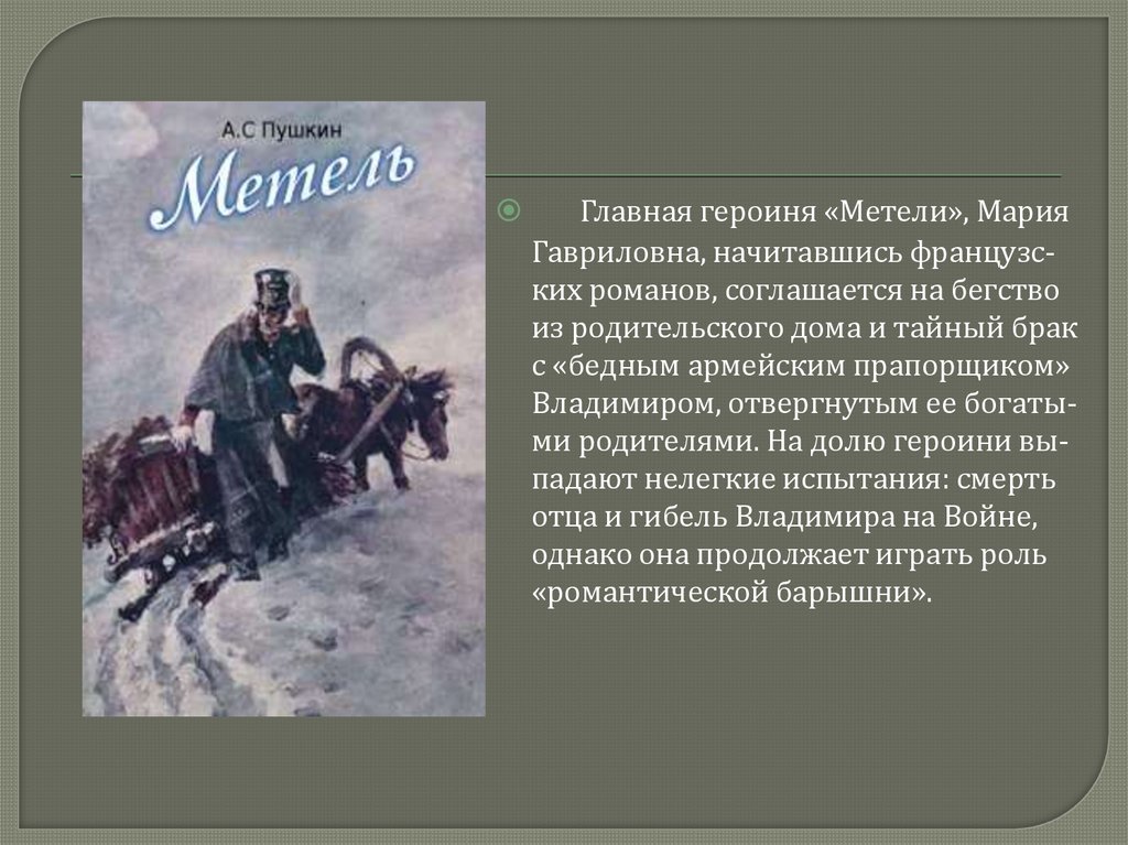 Главная героиня «Метели», МарияГавриловна, начитавшись французских романов, соглашается на бегство