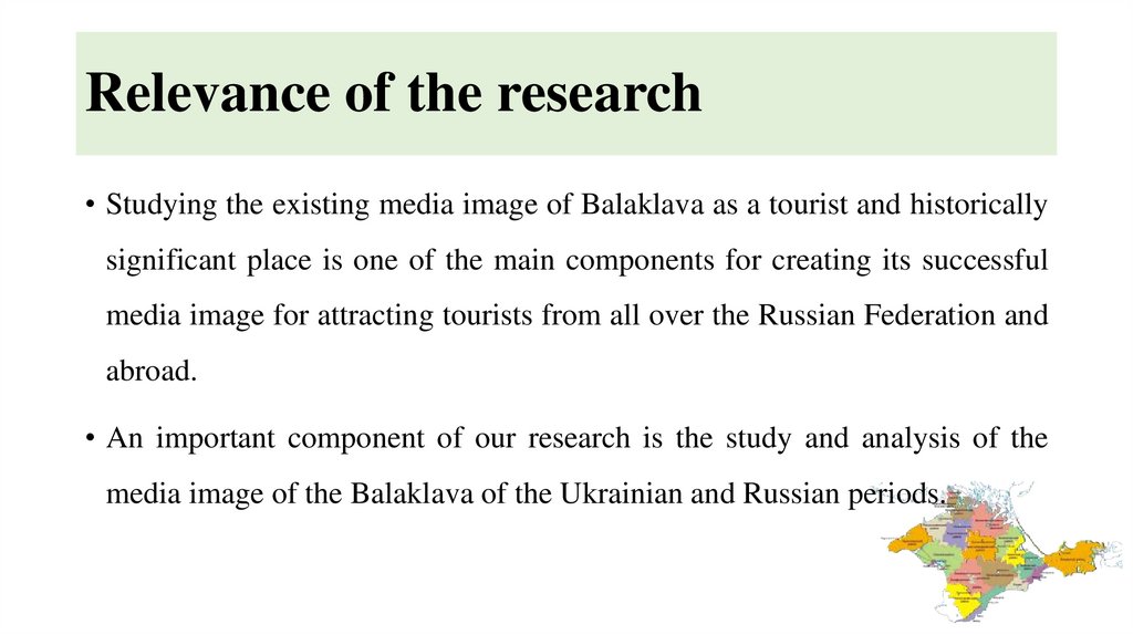 Relevance of the research• Studying the existing media image of Balaklava as a tourist and historically