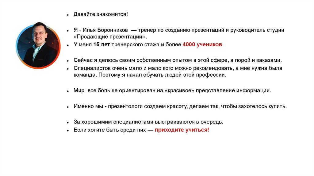 Давайте знакомится!Я - Илья Боронников — тренер по созданию презентаций и руководитель студии