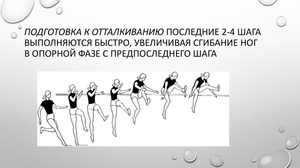 ПОДГОТОВКА К ОТТАЛКИВАНИЮ ПОСЛЕДНИЕ 2-4 ШАГАВЫПОЛНЯЮТСЯ БЫСТРО, УВЕЛИЧИВАЯ СГИБАНИЕ НОГ