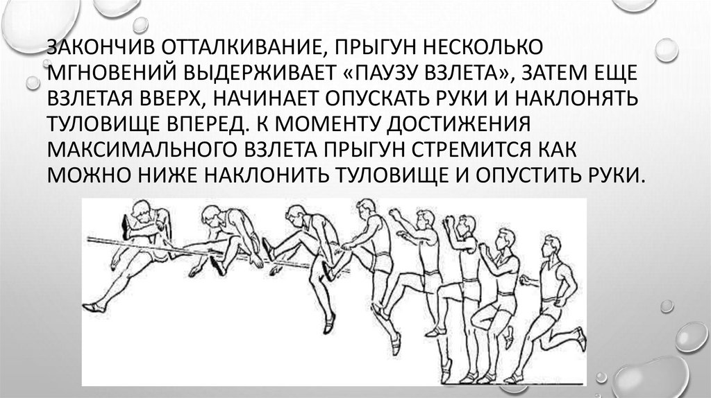ЗАКОНЧИВ ОТТАЛКИВАНИЕ, ПРЫГУН НЕСКОЛЬКОМГНОВЕНИЙ ВЫДЕРЖИВАЕТ «ПАУЗУ ВЗЛЕТА», ЗАТЕМ ЕЩЕ