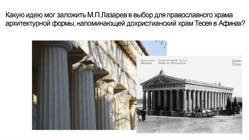 Какую идею мог заложить М.П.Лазарев в выбор для православного храмаархитектурной формы, напоминающей дохристианский храм Тесея в Афинах?