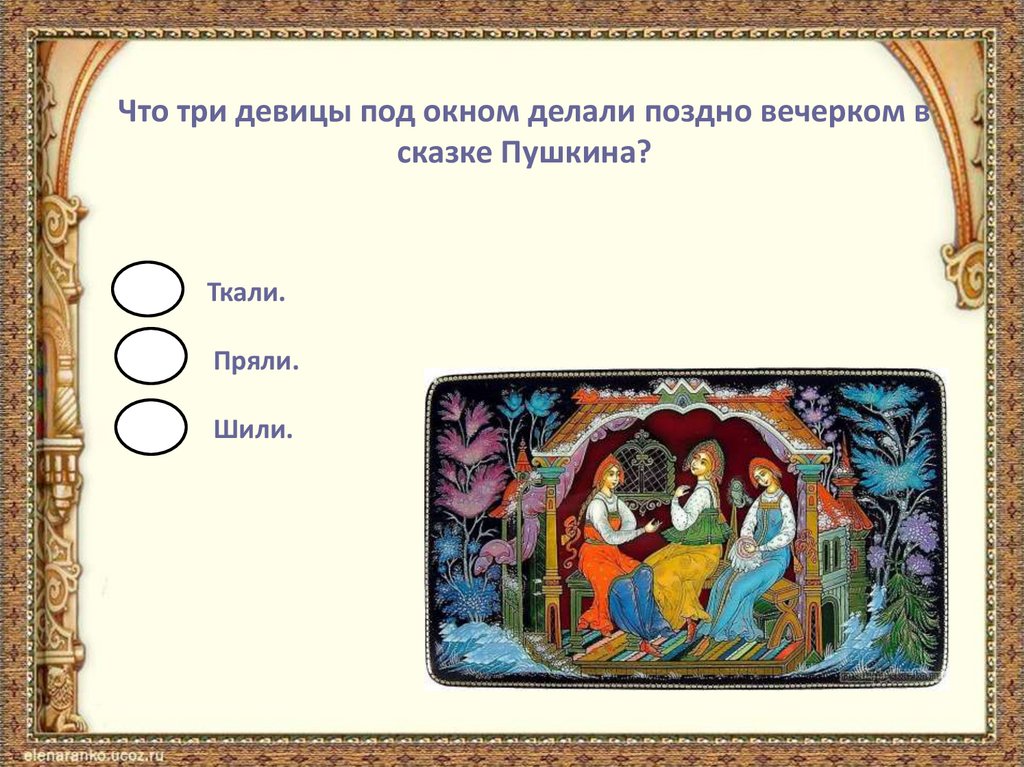 Что три девицы под окном делали поздно вечерком всказке Пушкина?