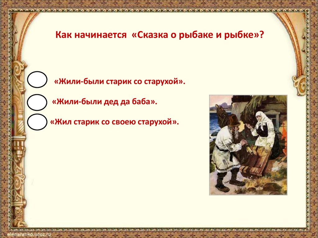 Как начинается «Сказка о рыбаке и рыбке»?«Жили-были старик со старухой».