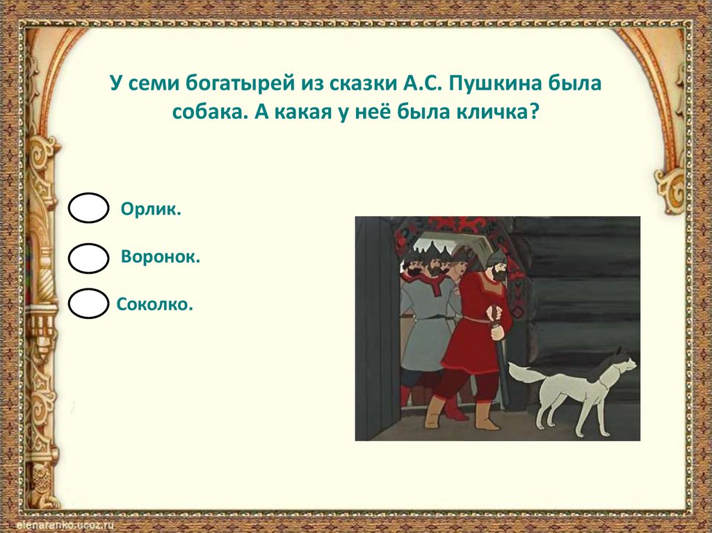 У семи богатырей из сказки А.С. Пушкина быласобака. А какая у неё была кличка?