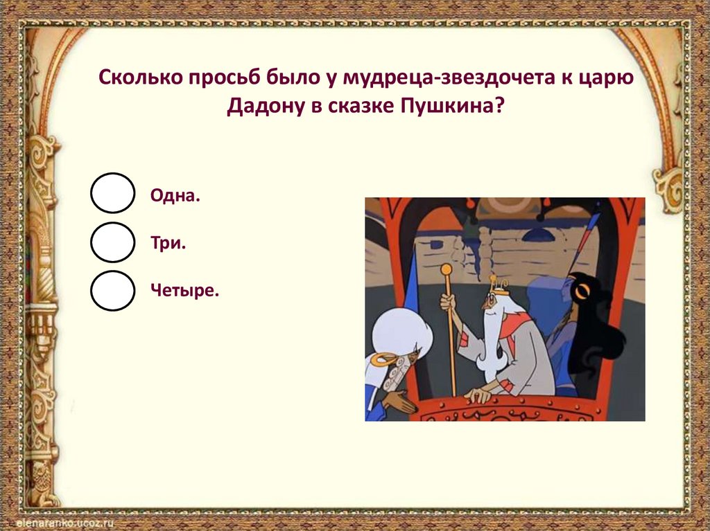 Сколько просьб было у мудреца-звездочета к царюДадону в сказке Пушкина?