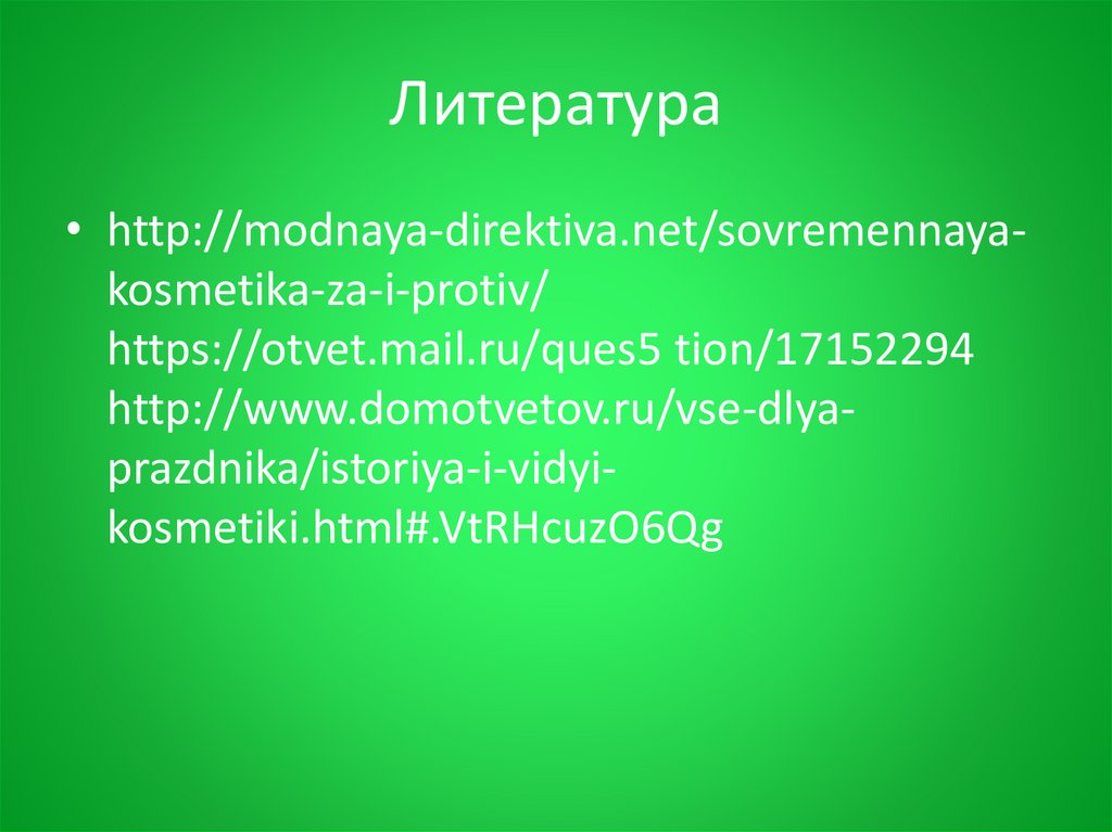 Литература• http://modnaya-direktiva.net/sovremennayakosmetika-za-i-protiv/