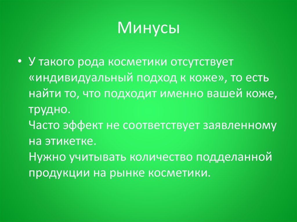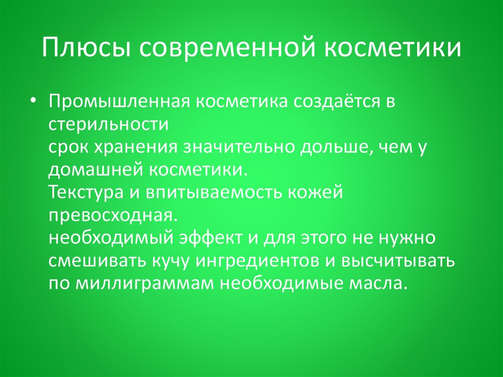 Плюсы современной косметики• Промышленная косметика создаётся в