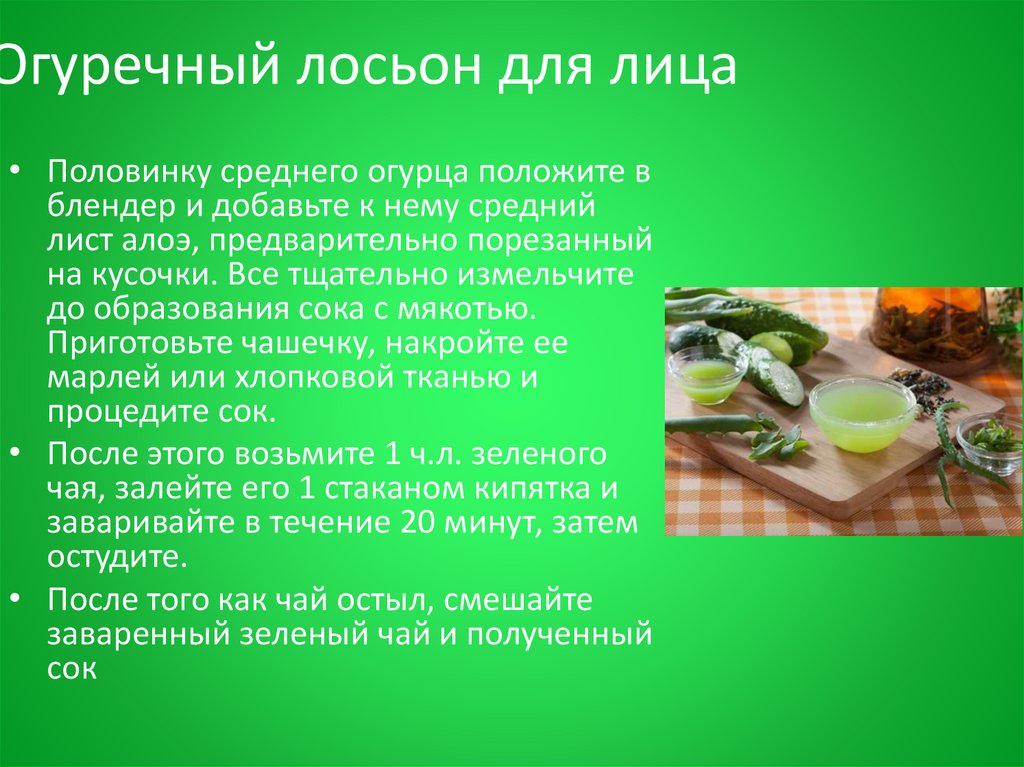 Огуречный лосьон для лица• Половинку среднего огурца положите в