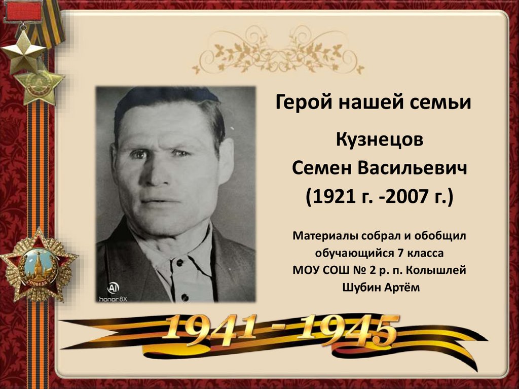 Герой нашей семьи Кузнецов Семен Васильевич (1921 г. - 2007 г.)