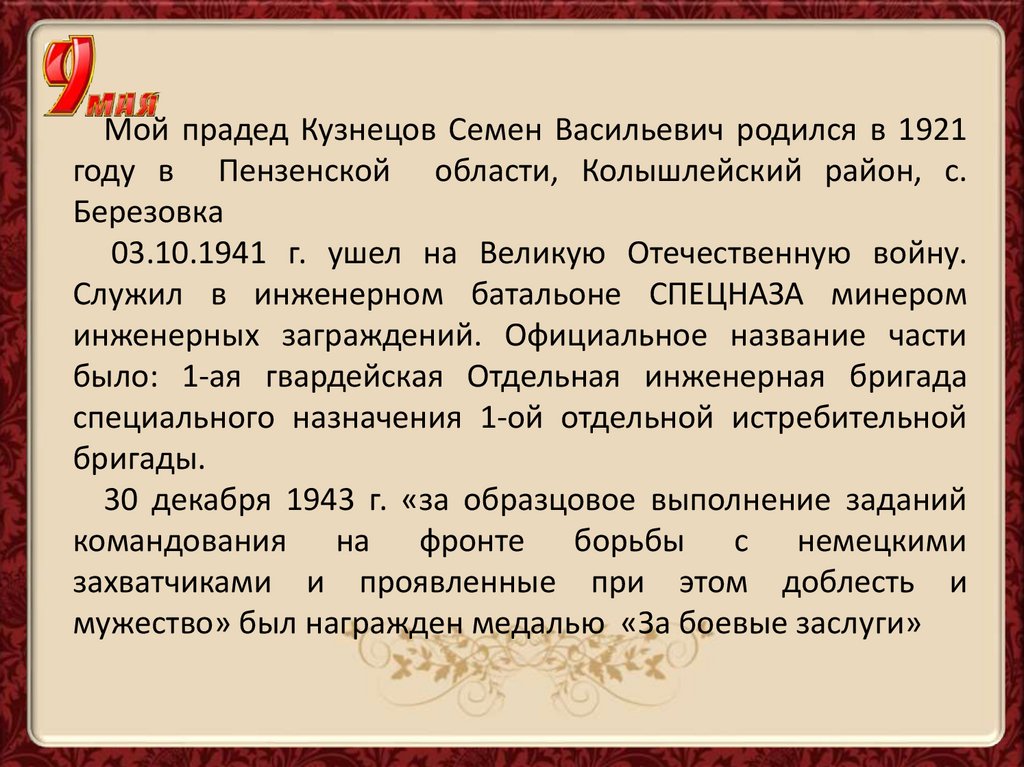 Мой прадед Кузнецов Семен Васильевич родился в 1921году в Пензенской области, Колышлейский район, с.