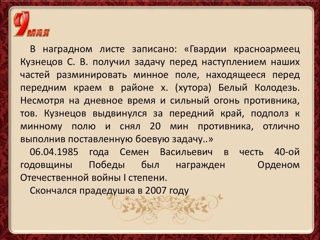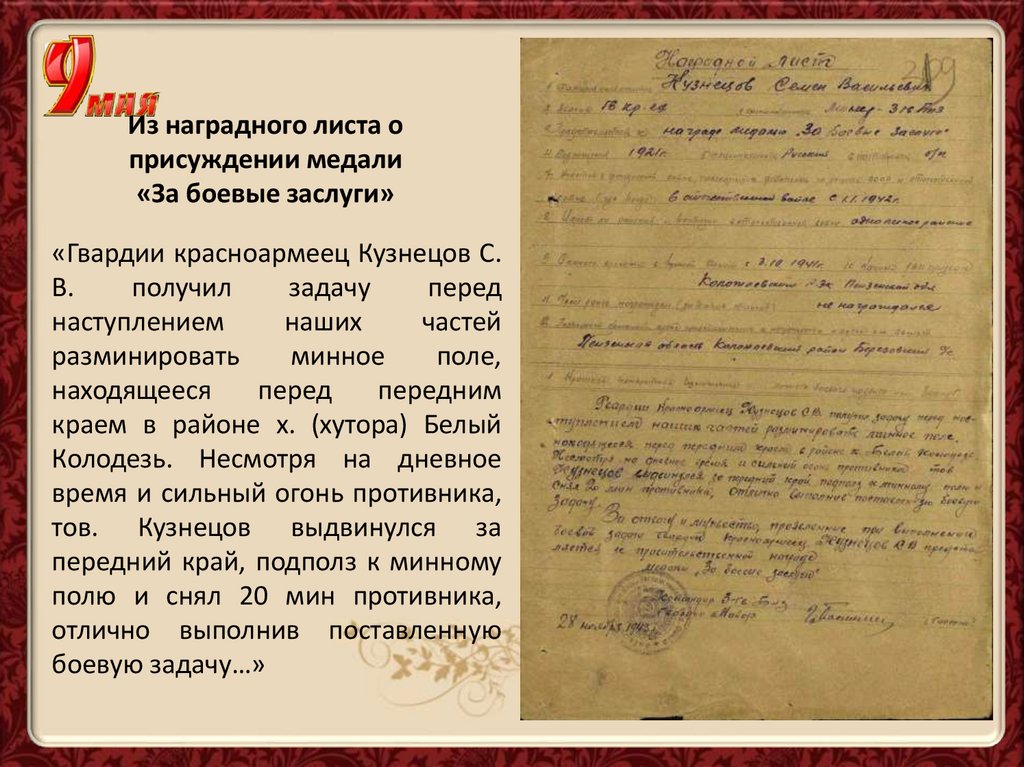 В наградном листе записано: «Гвардии красноармеецКузнецов С. В. получил задачу перед наступлением наших