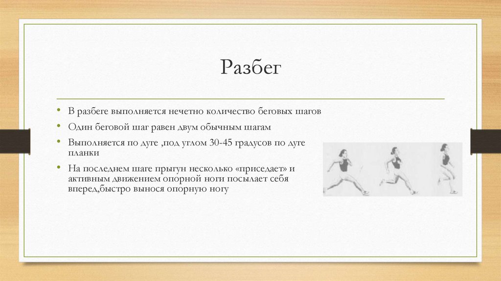 Разбег• В разбеге выполняется нечетно количество беговых шагов