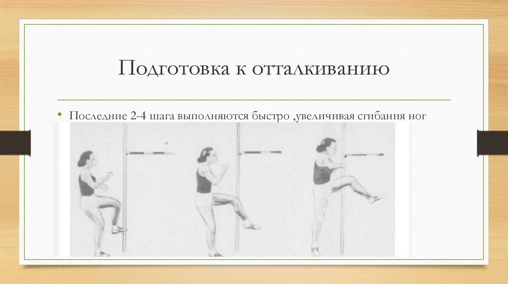 Подготовка к отталкиванию• Последние 2-4 шага выполняются быстро ,увеличивая сгибания ног