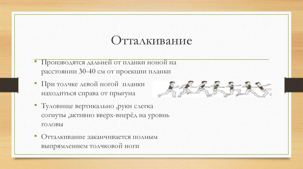 Отталкивание• Производятся дальней от планки ноной на