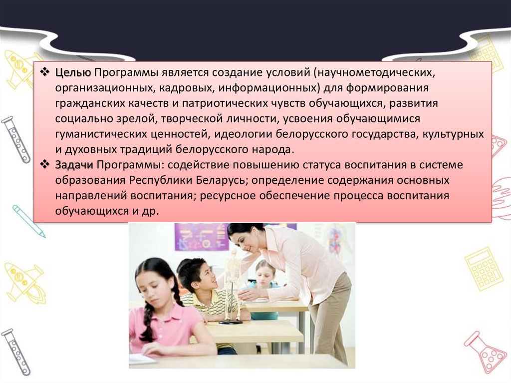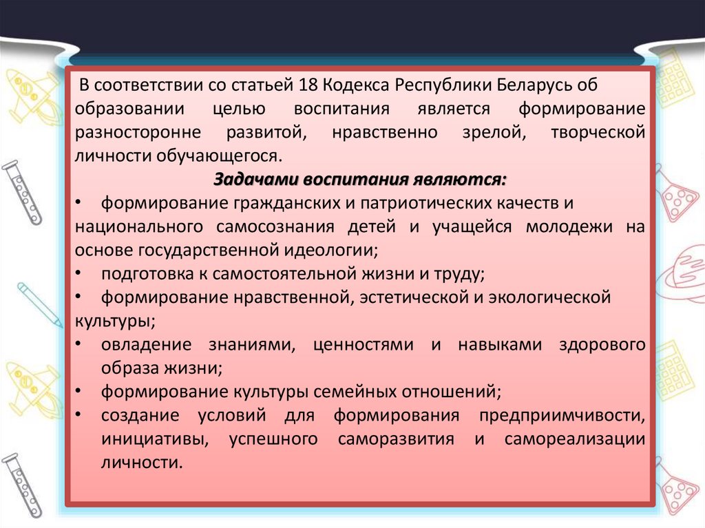 В соответствии со статьей 18 Кодекса Республики Беларусь обобразовании целью воспитания является формирование