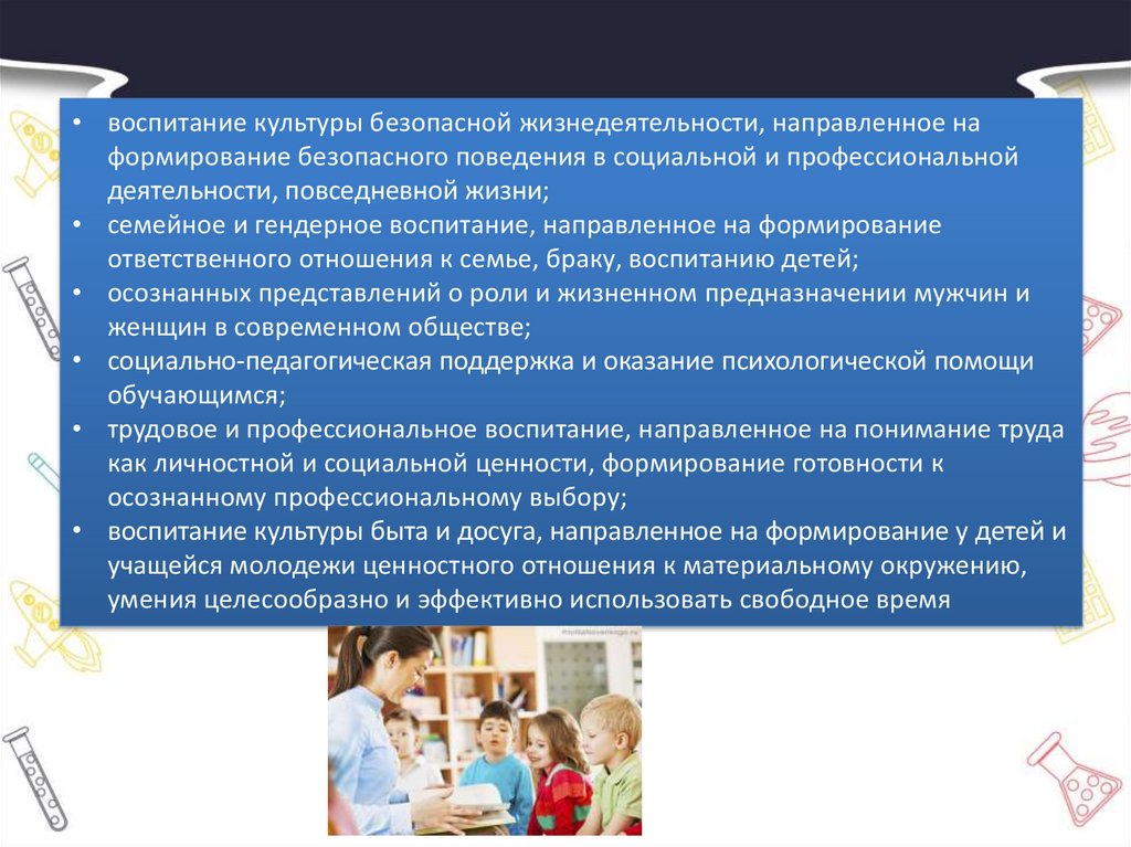 • воспитание культуры безопасной жизнедеятельности, направленное наформирование безопасного поведения в социальной и профессиональной