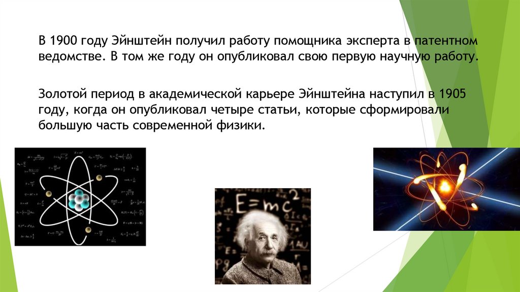 В 1900 году Эйнштейн получил работу помощника эксперта в патентномведомстве. В том же году он опубликовал свою первую научную работу.