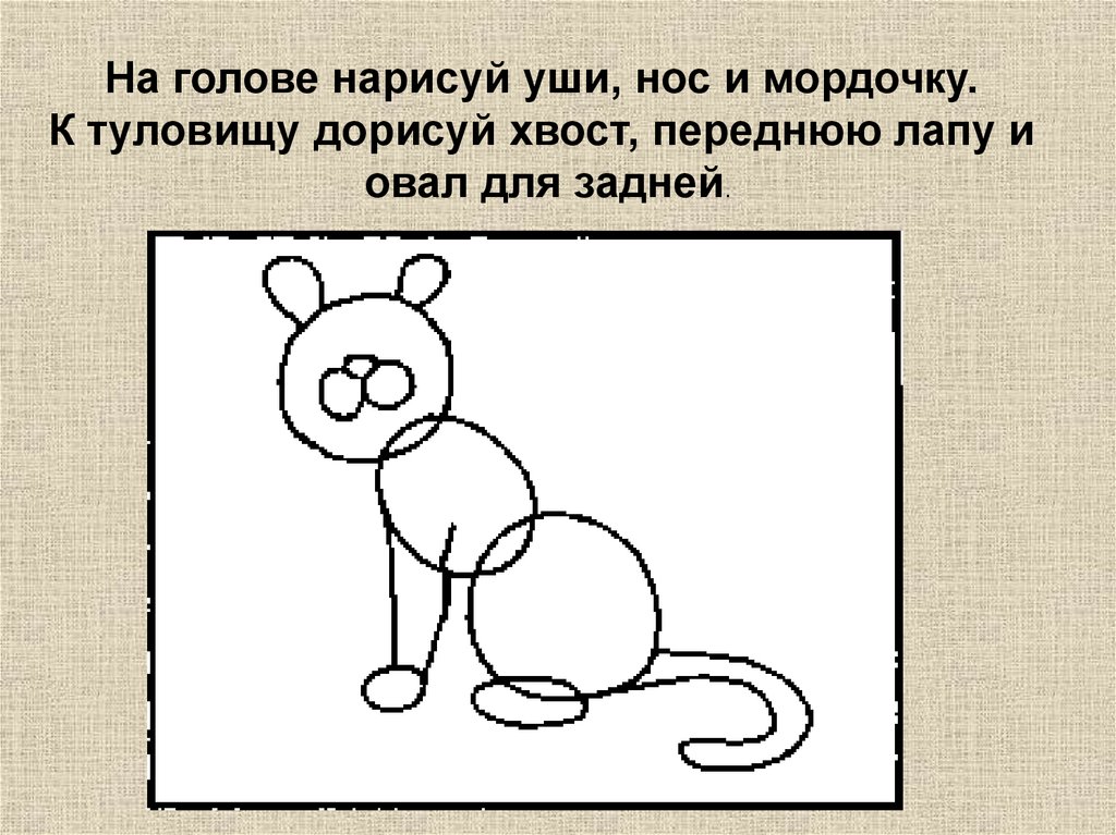На голове нарисуй уши, нос и мордочку.К туловищу дорисуй хвост, переднюю лапу и