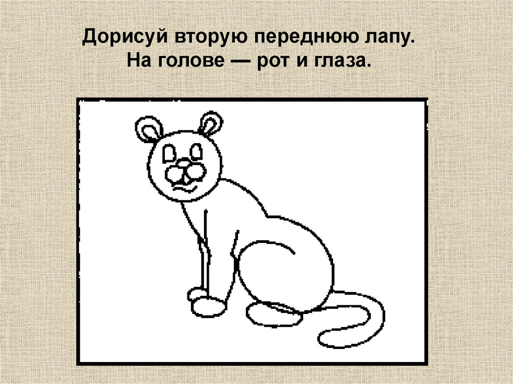 Дорисуй вторую переднюю лапу.На голове — рот и глаза.