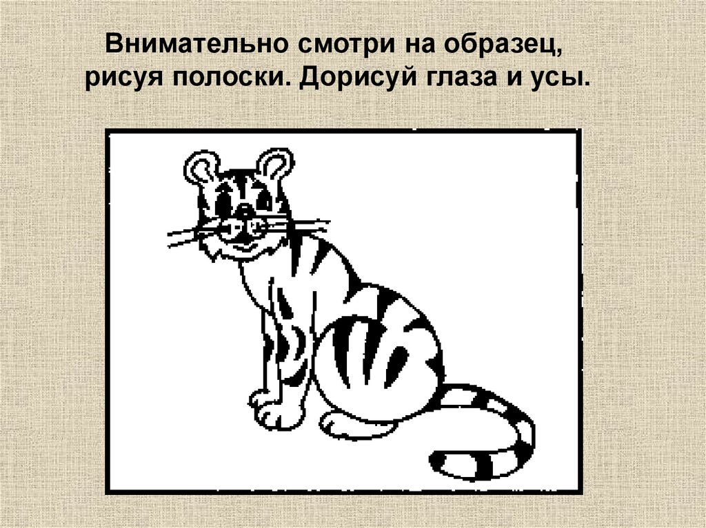 Внимательно смотри на образец,рисуя полоски. Дорисуй глаза и усы.
