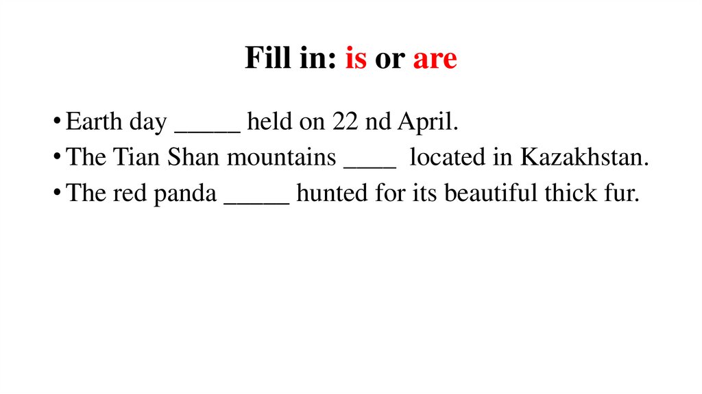 Fill in: is or are• Earth day _____ held on 22 nd April.