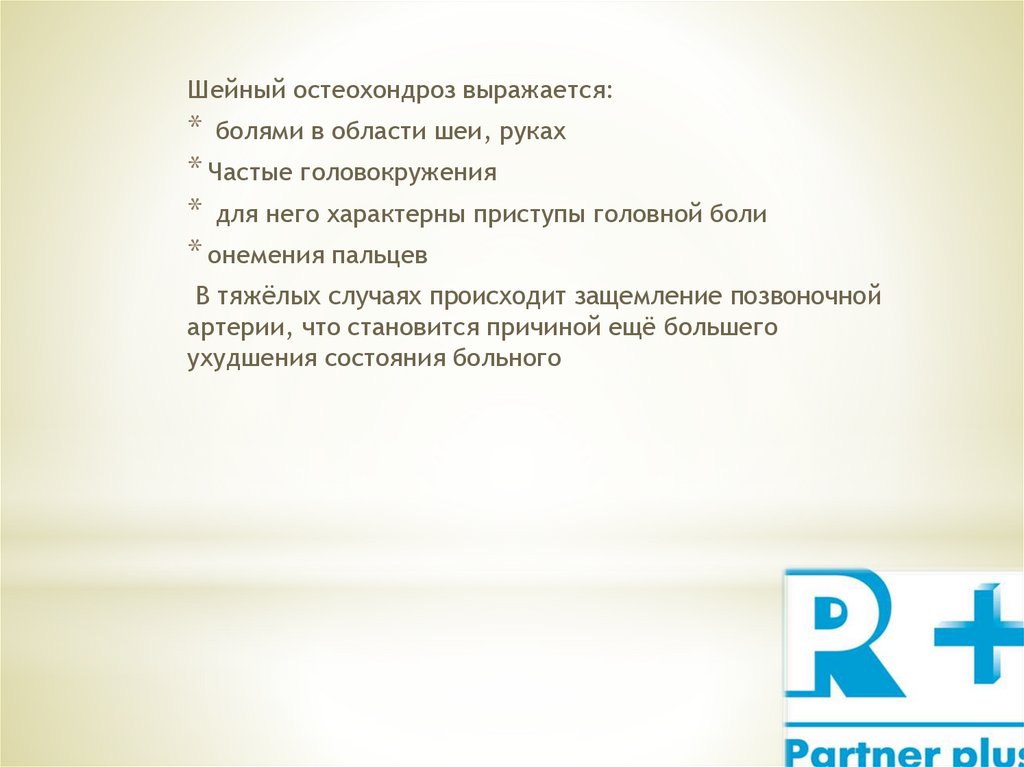 Шейный остеохондроз выражается:* болями в области шеи, руках