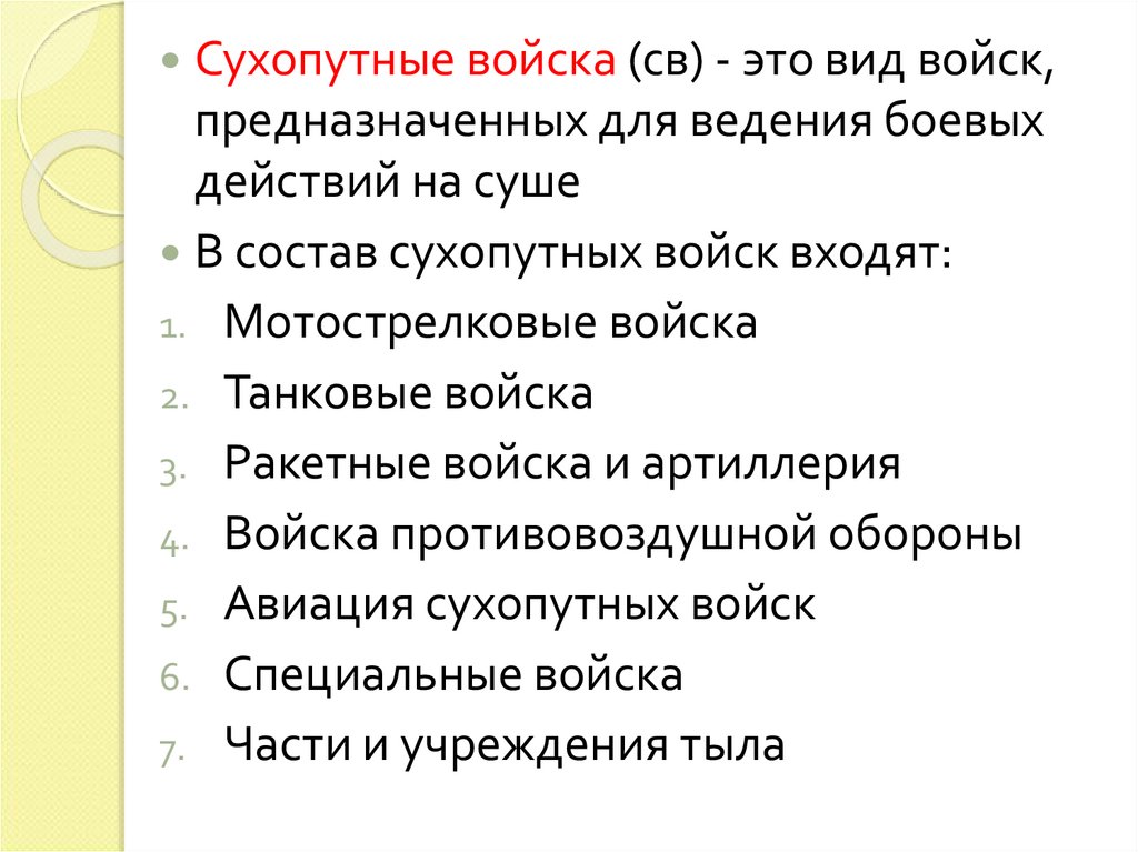 Сухопутные войска (св) - это вид войск,предназначенных для ведения боевых
