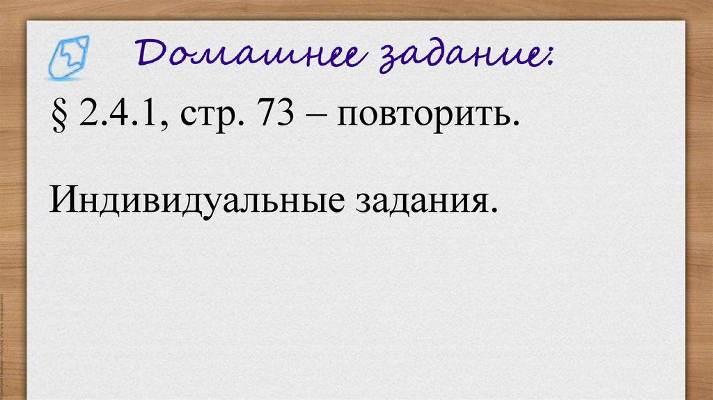 § 2.4.1, стр. 73 – повторить.Индивидуальные задания.