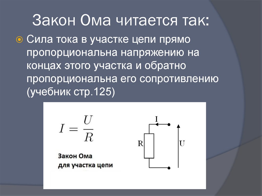 Закон Ома читается так:Сила тока в участке цепи прямо