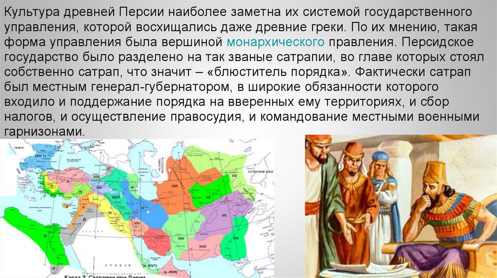 Культура древней Персии наиболее заметна их системой государственногоуправления, которой восхищались даже древние греки. По их мнению, такая