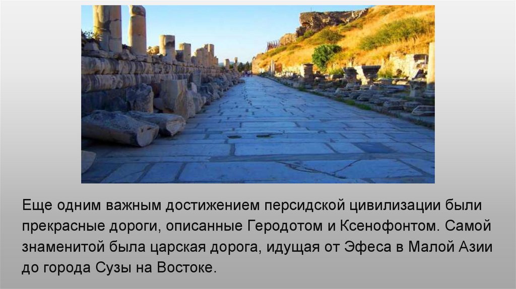 Еще одним важным достижением персидской цивилизации былипрекрасные дороги, описанные Геродотом и Ксенофонтом. Самой